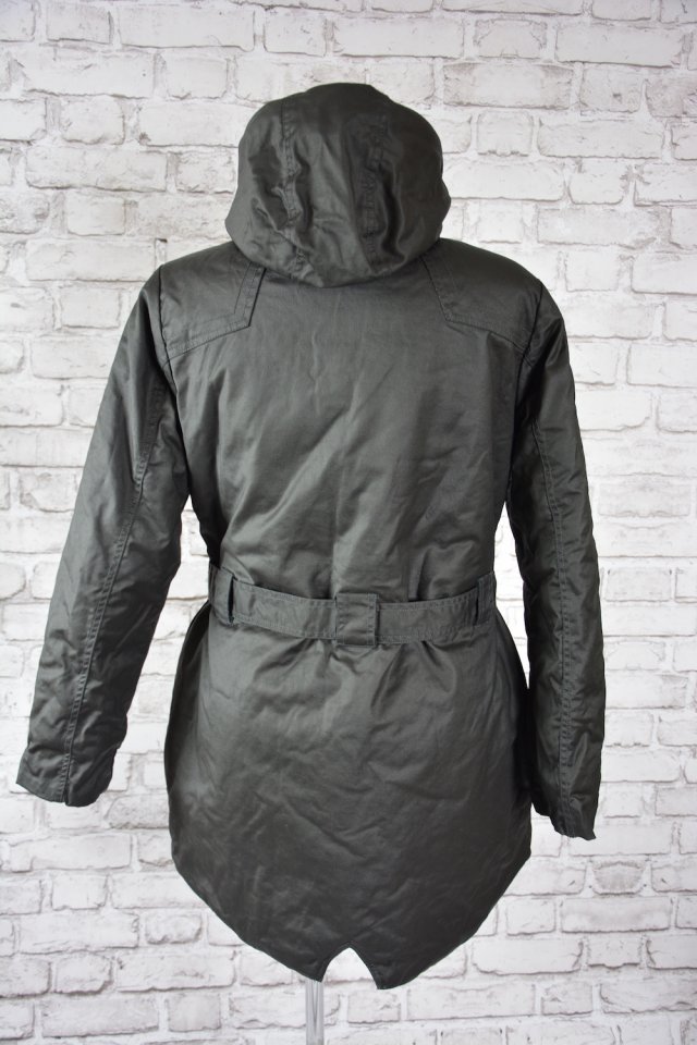 Woskowana kurtka marki Nev Viev o poszerzanym kroju, tył kurtki nieznacznie dłuższy. Kurtka posiada kaptur, zasuwana na suwak ukryty pod listwą, posiada dwie pary kieszeni- góra i dół, w pasie posiada pasek, ale nie jest wiązana- pasek jest regulowany za pomocą guzików.Wszystkie guziki logowane, to samo suwak.Ocieplana jak sądzę watą.