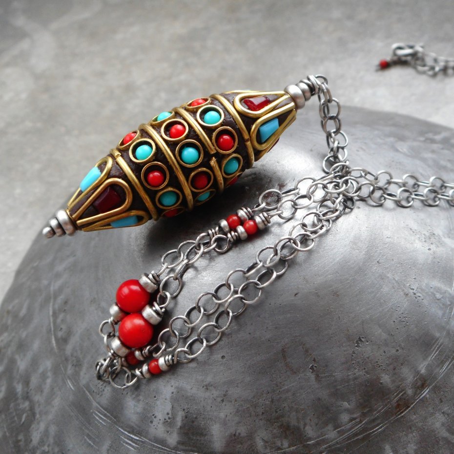 Dłuższy naszyjnik wykonany ze szlachetnego srebra i kamieni naturalnych; główną ozdobą naszyjnika jest koralik tybetański - mosiężne wrzeciono ( 40 mm) zdobione koralem i turkusem.