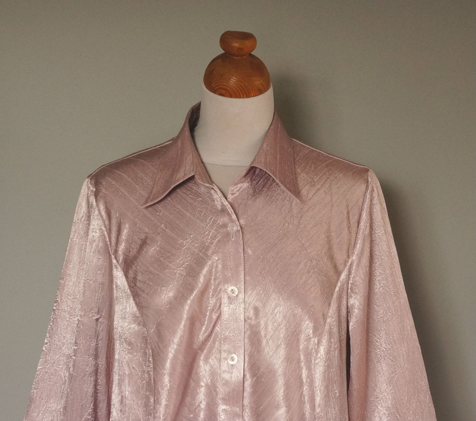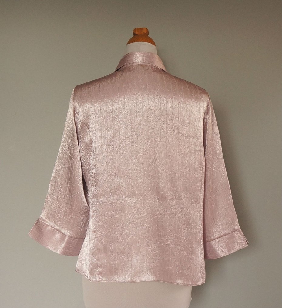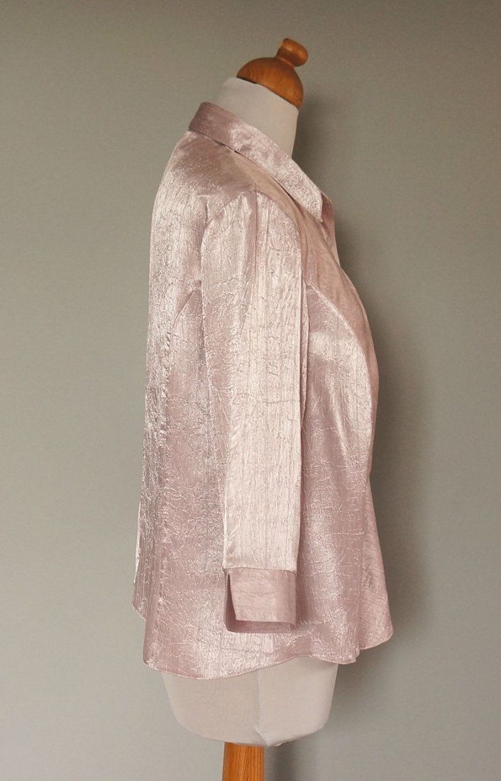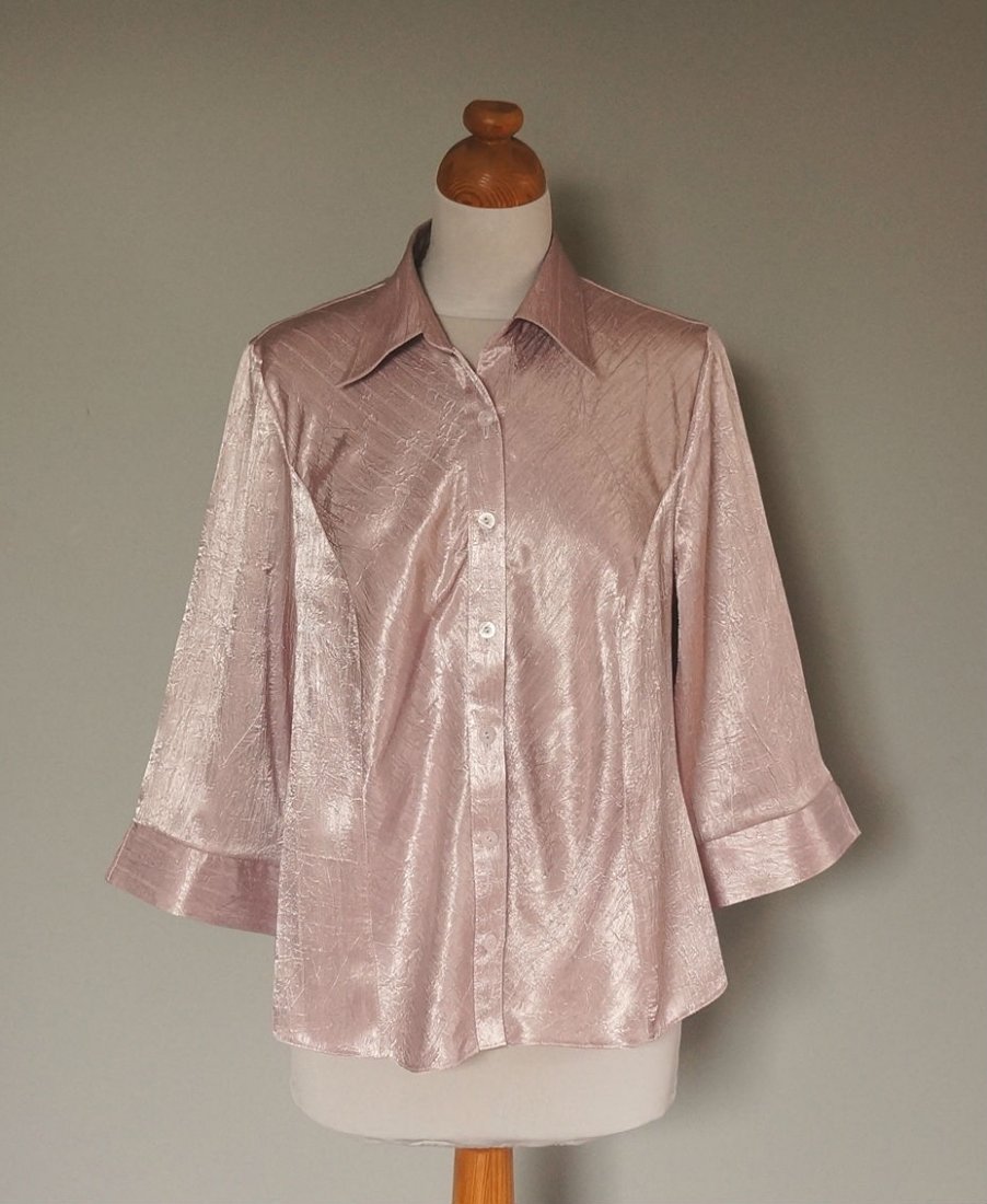 Damska bluzeczka w kolorze jasnego wrzosu. Tkanina lekko połyskująca, fabrycznie gnieciona. Rękawki ¾. Tkanina - 95% wiskoza, 5% poliuretan.