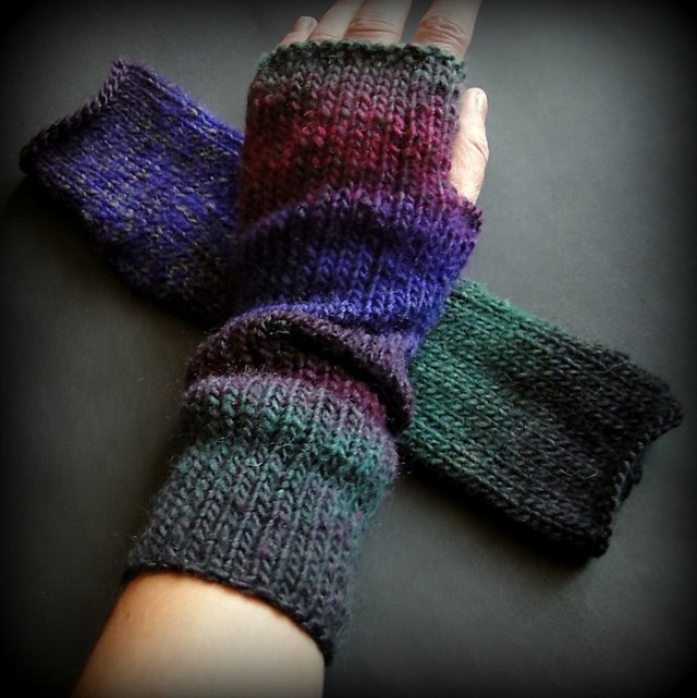 Ciepłe, mięsiste mitenki wykonane na drutach z włóczki ( 100% wełna ) - bezszwowe, długość ok. 29 cm. Przepiękne kolory ubarwią każde okrycie - w rzeczywistości bardziej stonowane. Polecam. Ze względu na układ barw - pojedynczy egzemplarz.