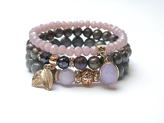 Komplet trzech bransoletek wykonanych z naturalnych kamieni: larvikit z powłoką AB [8mm], marmur [10mm], jadeity fasetowane [10mm], fasetowanych kryształków [4 x 6mm i 8mm], , efektownej przywieszki ze szkła w platerowanej oprawie oraz elementów metalowych w kolorze tzw. różowego złota. Bransoletki pasują na nadgarstek 16 - 17cm. Biżuteria ozdobnie zapakowana