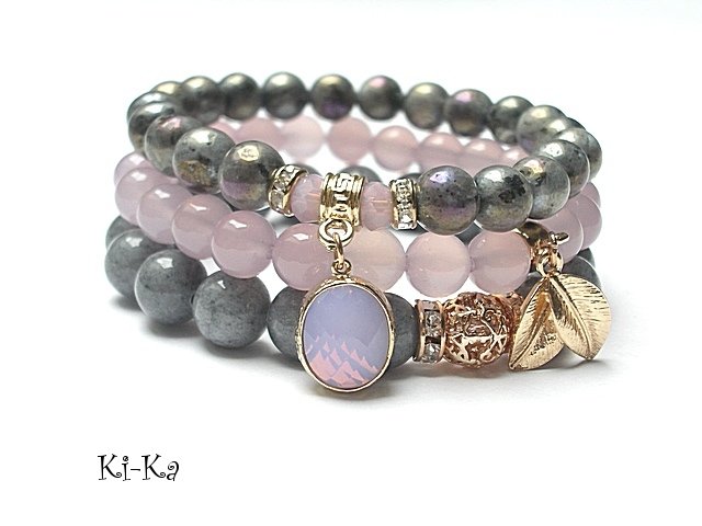 Komplet trzech bransoletek wykonanych z naturalnych kamieni: larvikit z powłoką AB [8mm], marmur [10mm], agaty transparentne [8mm], fasetowanych kryształków [4 x 6mm], efektownej przywieszki ze szkła w platerowanej oprawie oraz elementów metalowych w kolorze tzw. różowego złota. Bransoletki pasują na nadgarstek 16 - 17cm. Biżuteria ozdobnie zapakowana