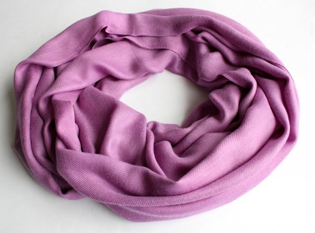 Duży, miękki szal pięknym odcieniu wrzosowego fioletu wykonany w mojej ocenie z wiskozy.
