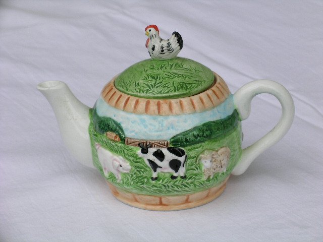 Unikalny, radośnie wiejskim pejzażem zwierząt zdobiony lekki porcelanowy imbryk na herbacianą esencję lub jedną porcję ziółek :) Ręcznie fakturowo wytłaczany, ręcznie malowany, na błyszcząco szkliwiony. Sygnowany Leonardo. Wyjątkowy, do ukochania i dla radosnej celebracji :) Pękatość 8,5; długość 14,5; wys. 9 cm. Przykrywka z języczkiem blokującym. Stan zachowania bardzo dobry.