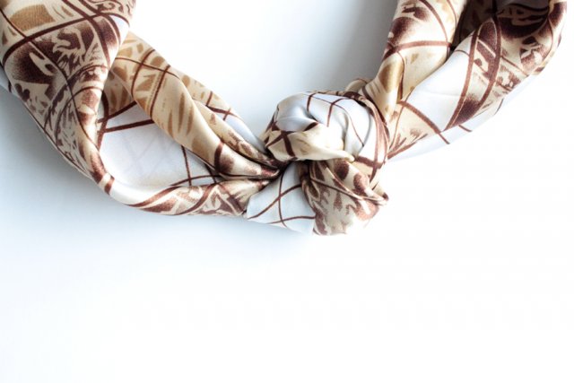 Chusta w ciekawe wzory w klasycznych kolorach. Materiał to prawdopodobnie jedwab naturalny lub syntetyczny.