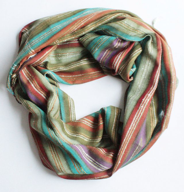 Wielobarwny szal o nieregularnej, miejscami luźniejszej fakturze. Materiał to prawdopodobnie wiskoza.