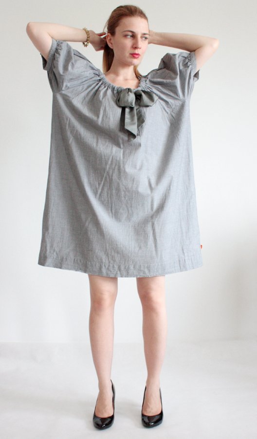 Sukienka o luźnym fasonie z wielką, przykuwającą wzrok kokardą, dzięki której można modyfikować dekolt.