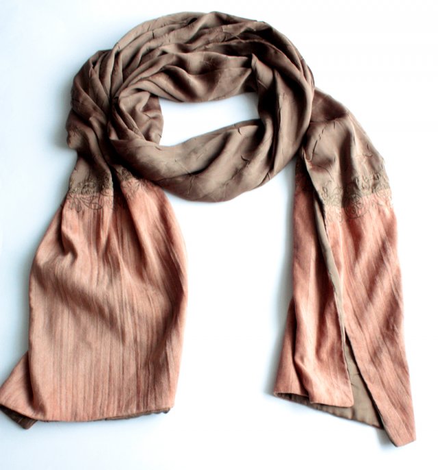 Duży, oryginalny szal w odcieniach jasnego brązu i łososiowego, przydymionego różu. Część brązowa posiada ciekawą, gdzieniegdzie gniecioną fakturę. Część różowa natomiast w dotyku przypomina aksamit lub welur.