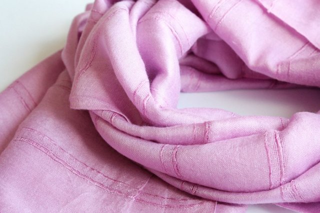 Miękki, duży szal w przepięknym odcieniu jasnego fioletu wpadającego w subtelny różu. Materiał oceniam na mieszankę jedwabiu i bawełny.