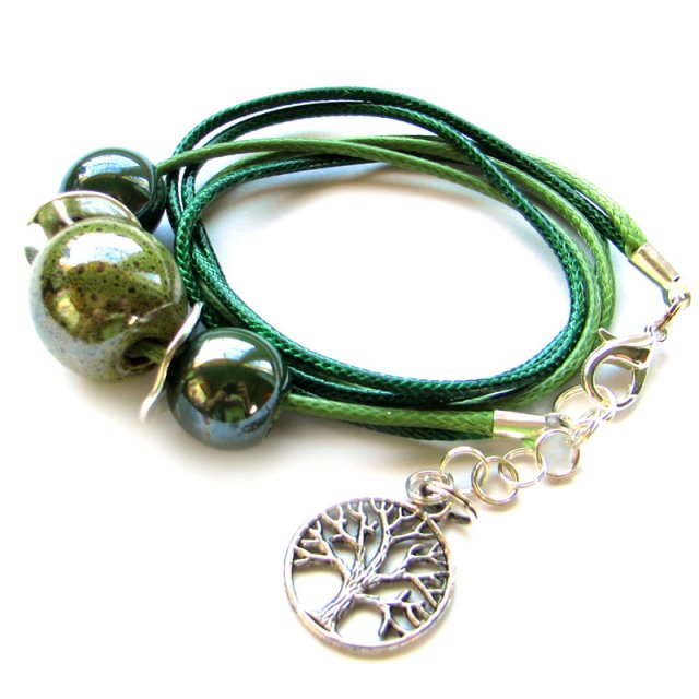 Bransoletka wykonana z 2 zielonych woskowanych sznurków bardzo dobrej jakości, korali ceramicznych, przekładek młotkowanych oraz dowieszki drzewka. Do 3-krotnego owinięcia wokół nadgarstka. Długość 56 cm, w tym 4 cm łańcuszka do regulacji, pasuje na nadgarstek 15-19cm. Zapięcie na karabińczyk.