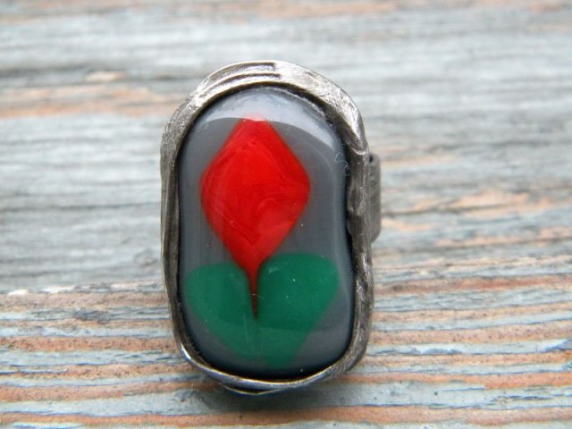 Szklany kaboszon w ocynowanej miedzi.