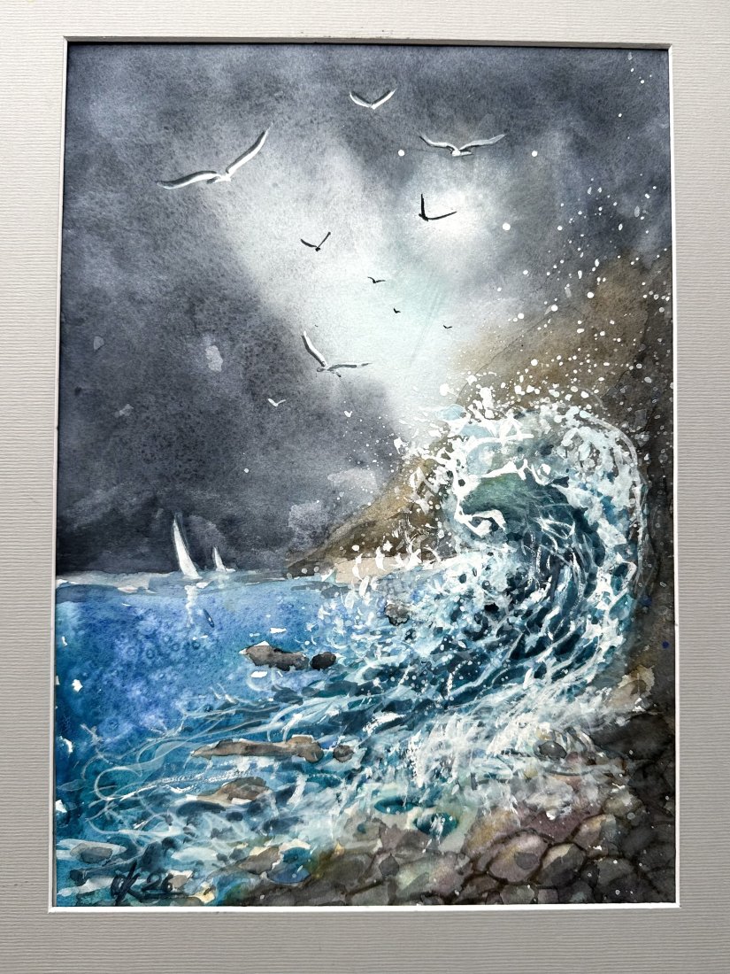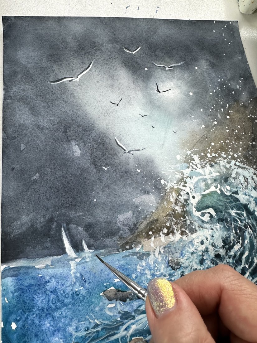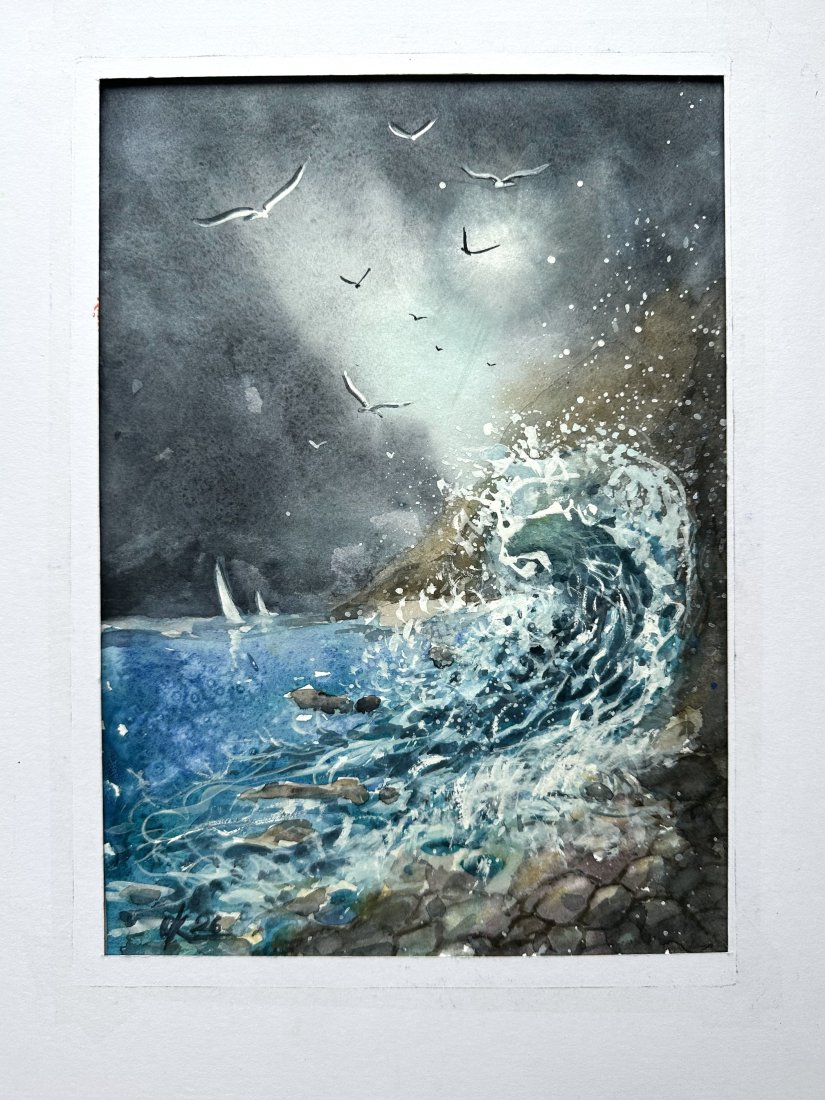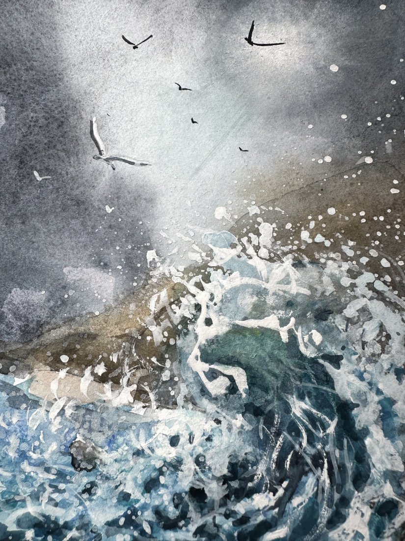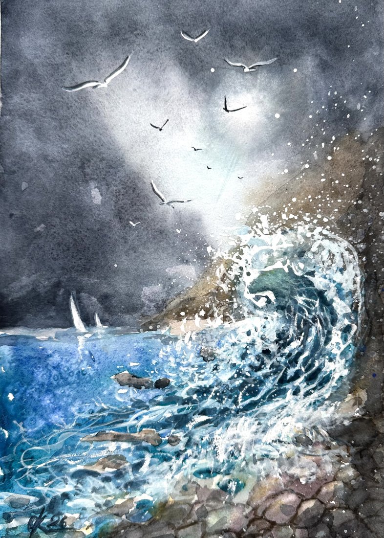 Tagi: #akwarelowy krajobraz, #mewy i burza, #ocean i mewy, #wybrzeże morskie