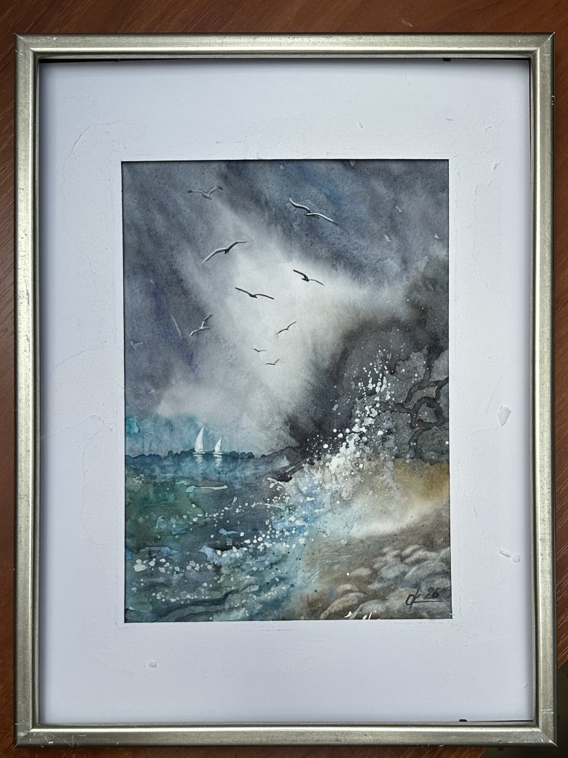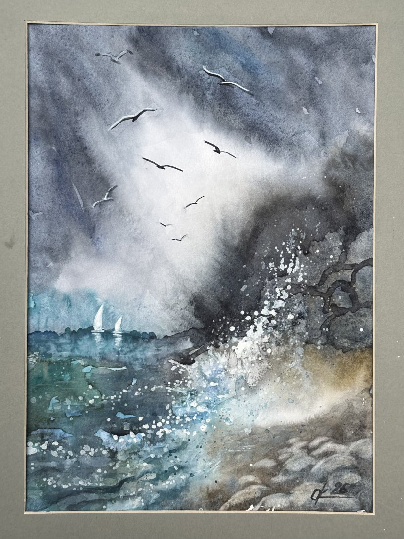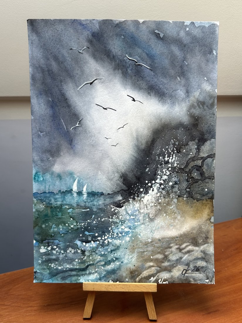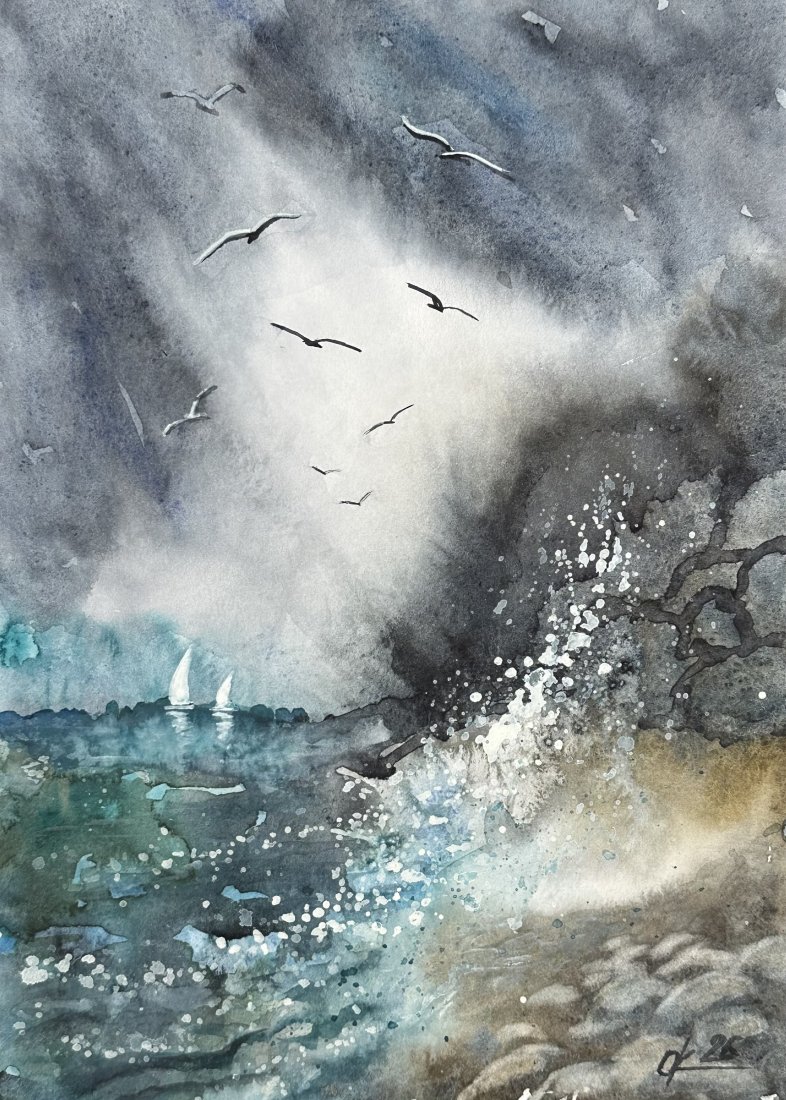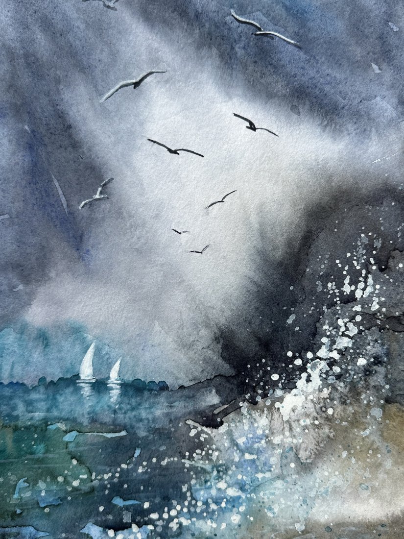 Tagi: #akwarelowy krajobraz, #mewy i burza, #ocean i mewy, #wybrzeże morskie