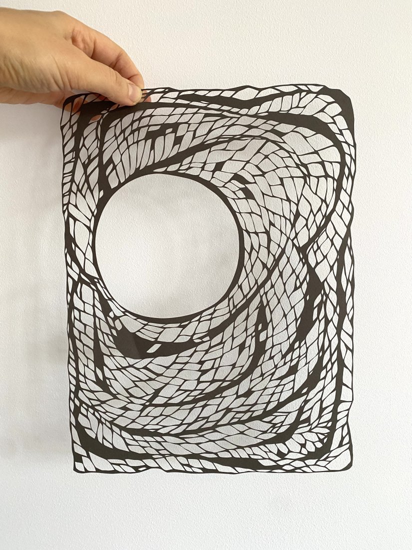Jest to ręcznie wycinana skalpelem praca, stworzona na bazie bardzo ogólnego szkicu. Podczas pracy lubię odchodzić od pierwotnego rysunku i wycinać swobodnie, bez trzymania się początkowego planu – ta wolność daje mi energię i sprawia, że mogę z przyjemnością poświęcić wiele godzin na misterne wycinanie detali.