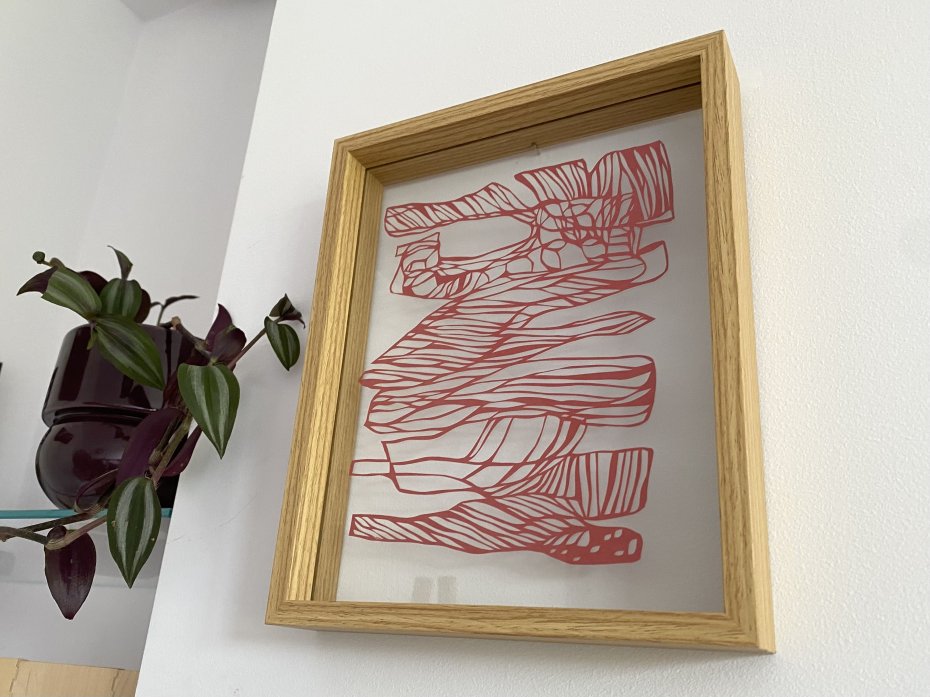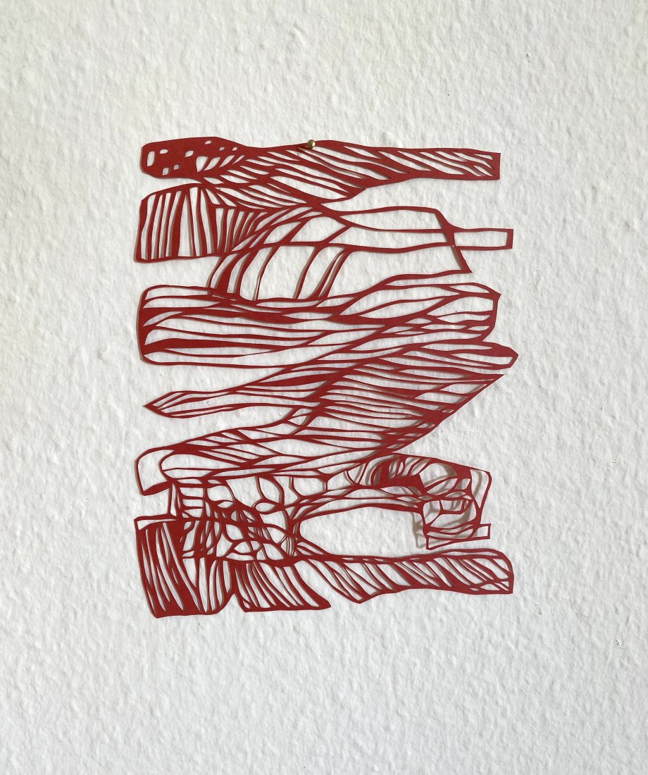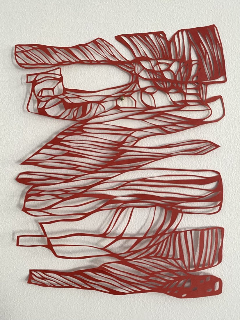 Unikatowa, ażurowa, ręcznie wykonana praca z papieru, w kolorze czerwonym, o abstrakcyjnej formie nieregularnego prostokąta wypełnionego swobodną linią.