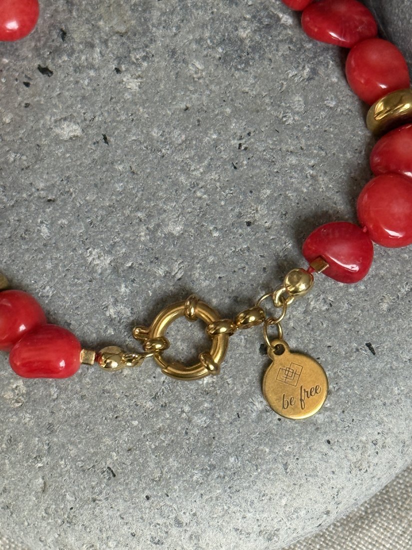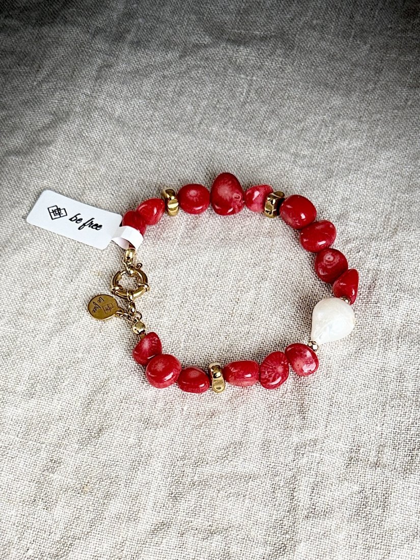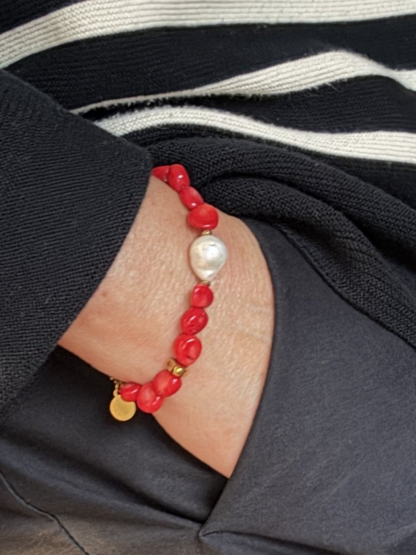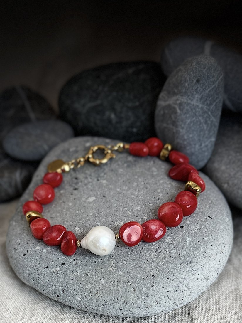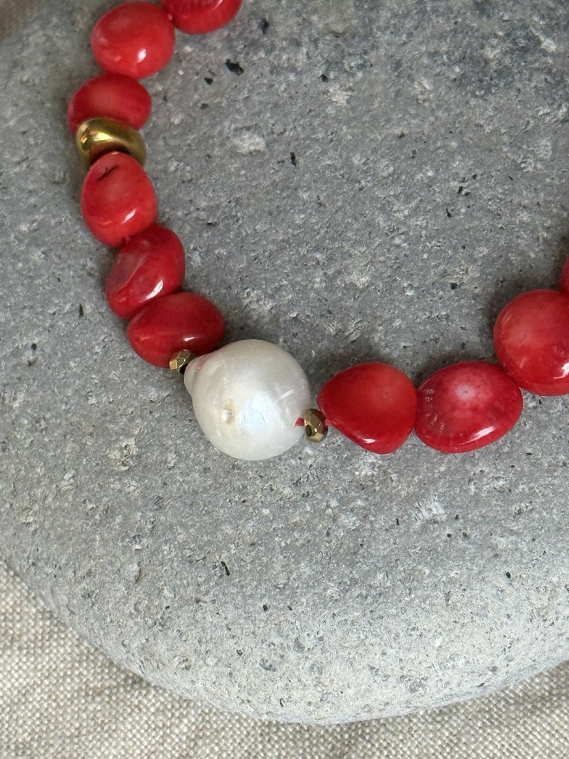 Podkreśl swój codzienny styl dzięki tej eleganckiej, ręcznie wykonanej bransoletce z intensywnie czerwonych, barwionych korali, uzupełnionych perłą barokową o pięknym blasku. Każdy koralik ma nieregularny, naturalny kształt, co nadaje biżuterii wyjątkowy, organiczny charakter i podkreśla piękno niedoskonałości.