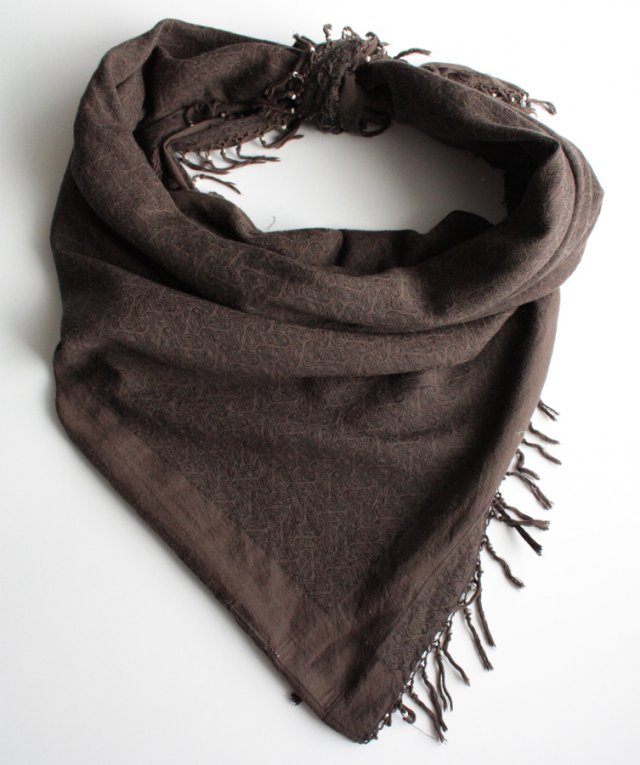 Oryginalna chusta o ciekawej fakturze. Dwa brzegi wykończone frędzlami z koralikami.