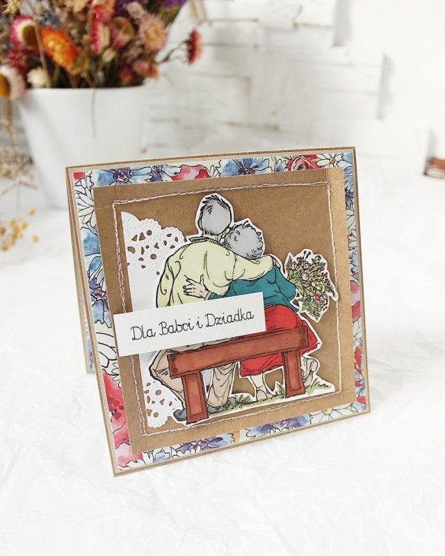 Wyjątkowa kartka dla wyjątkowych osób - dziadków. Wykonana na ekologicznym papierze, ozdobiona ręcznie kolorowanym stemplem przedstawiającym starszą parę siedzącą na ławeczce.