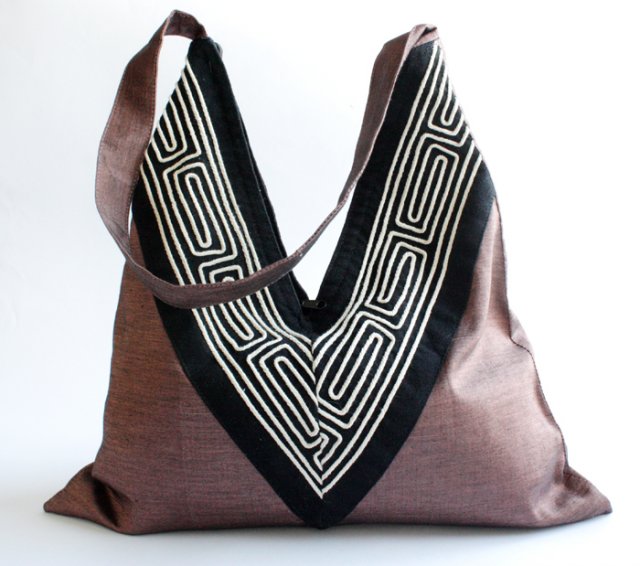 Torba o niezwykle oryginalnym kształcie, zapinana na suwak. Wewnątrz kieszonka. Materiał to prawdopodobnie jedwab z domieszką bawełny.