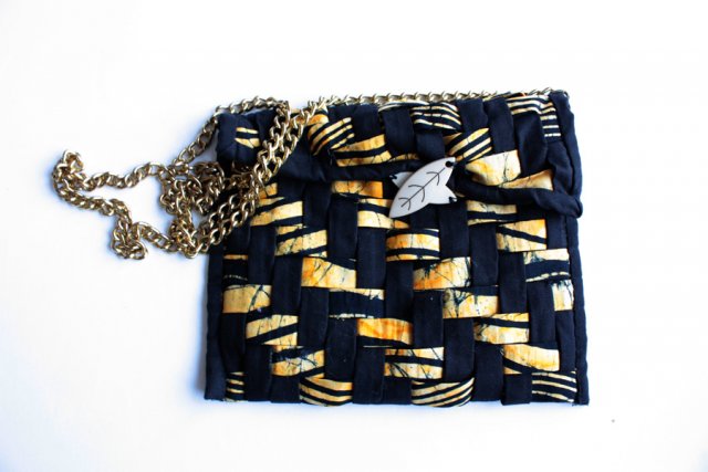 Wspaniała, absolutnie wyjątkowa torebeczka wykonana z uszytych pasów materiału jednakowej szerokości, fantazyjnie plecionych. Posiada podszewkę. Zapięcie na magnes. Stan bardzo dobry, nie ma śladów użytkowania. Efektowny łańcuszek w kolorze złotym.
