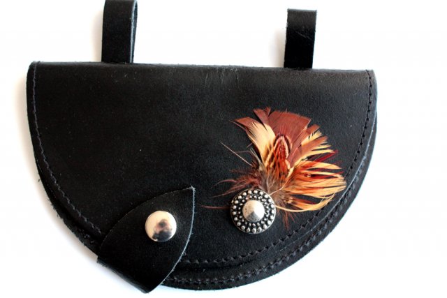 Wyjątkowa torebeczka do noszenia na pasku w talii lub na biodrach. Zapinana na zatrzask. Wykonana prawdopodobnie ze skóry naturalnej. Skóra ma drobne ślady użytkowania widoczne na ostatnim zdjęciu (widać to tylko po przyjrzeniu się z bliska).