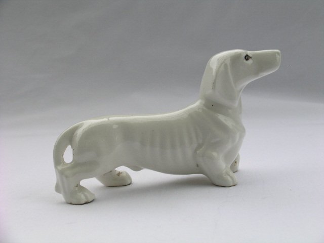 Porcelanowy, niemały jamnik z charakterem i historią. Dawniej cały ręcznie malowany, teraz w albinotycznej, oryginalnej odsłonie fakturowości i ciepłej, śmietanowej bieli. Dumny, z osobowością. Do kolekcji dla miłośnika rasy :) Zdarzył mu się w historii wypadek i tylna łapka klejona. 12,5 x 4 x 7 cm. Stan zachowania dobry minus klejenie.