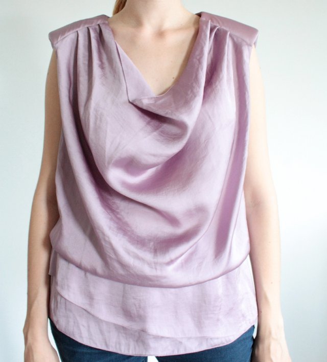 Piękna bluzka marki HUGO BOSS o niezwykłym fasonie, który można układać na kilka sposobów (widoczne na zdjęciach). Można nosić ją jako tunikę opuszczając ją niżej lub lekko udrapować i nosić jako typową bluzkę. W górnej części na wysokości ramion wszyto gąbeczki (nie są to poduszki!), które ładnie modelują fason i sprawiają, że utrzymuje się on w ryzach podczas noszenia.