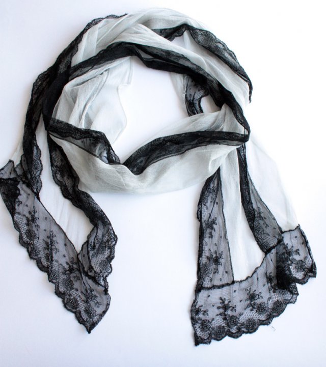 Wyjątkowy szal z dwóch łączonych tkanin- jasnoszarej siateczki i czarnej koronki.