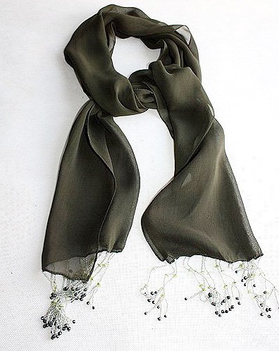 Szal w kolorze ciemnej, butelkowej zieleni, ozdobiony frędzlami z koralików. Materiał to prawdopodobnie żorżeta.