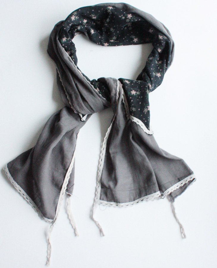 Miękki szal z aplikacjami i ciekawym wykończeniem brzegów.