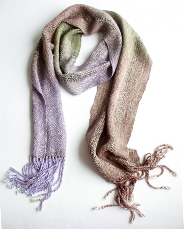 Miękki, luźno tkany szal w pięknych stonowanych odcieniach fioletu, zieleni i brązu. Materiał oceniam na bawełnę z jedwabiem.