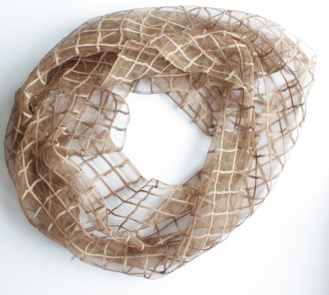 Piękny, subtelny szal o doskonałym składzie i nietypowej, transparentnej fakturze przetykanej kraciastym motywem.