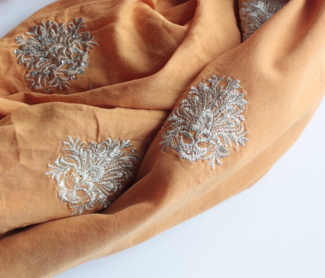 Wielki, miękki szal w kolorze miodowym, z haftami ozdobionymi miejscami kryształkami. Materiał to prawdopodobnie bawełna lub wiskoza.