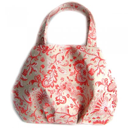 Torebka uszyta z usztywnionego mięsistego żakardu w kolorze jasnym beżowym z czerwonymi wzorami. Wymiary torebki: u podstawy 29 cm, wejście torebki 42 cm, wysokość 26 cm, długość rączek 41 cm. W środku czerwona podszewka oraz kieszonki wielkości 22x16 cm oraz 21x16 cm. Zapięcie na magnes-zatrzask. W środku wstążeczki pozwalające zmieniać kształt torebki, będące ozdobą torebki. Cała torebka jest misternie wykończona ozdobnymi ściegami. Kliknij na zdjęcie, aby zobaczyć 2 sposoby noszenia torebki oraz zdjęcie wnętrza torebki.