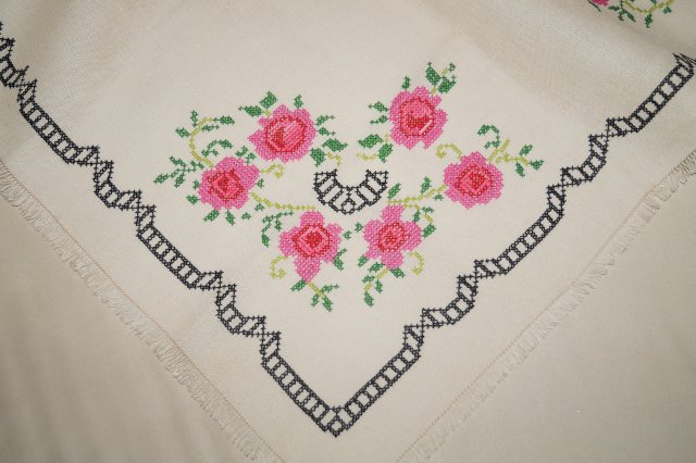 Obrusik- haft krzyżykowy na kanwie w kolorze ecru, wymiary: 76 x 67 cm, brzeg surowo wykończony