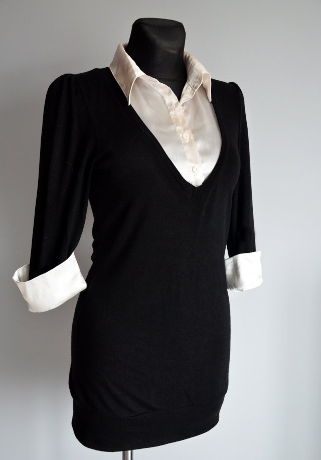 Elegancki dwuczęściowy długi sweterek marki GERI C New York. Część swetrowa czarna, dzianinowa. Bluzka satynowa w kolorze ecru, zapinana na guziczki. Rękawy 3/4, wywijane w formie mankietów. Dzianina elastyczna. Na dole szeroki ściągacz.