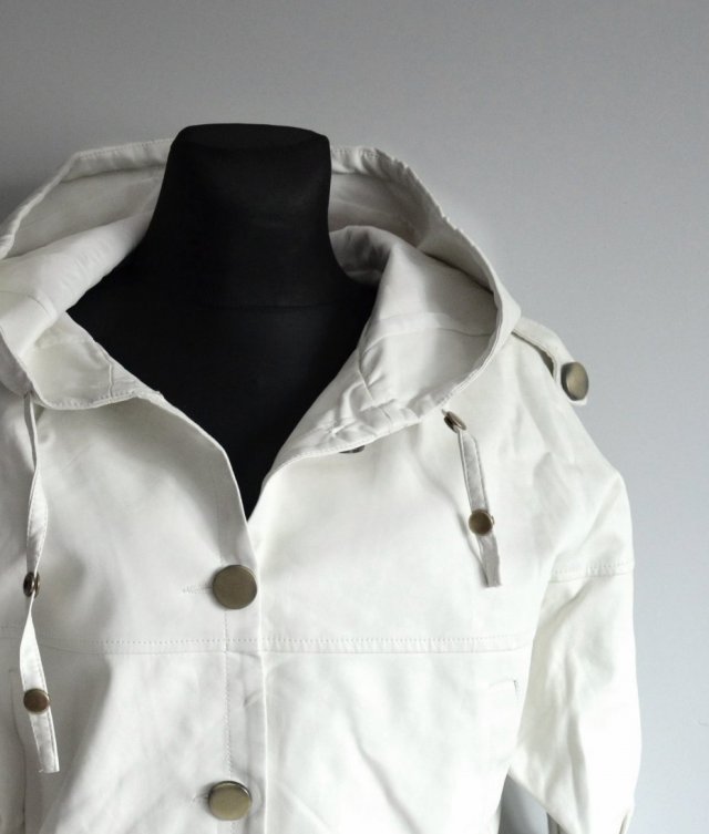 Stylowa, nowa kurteczka (z metką) z miękkiego materiału imitującego skórę. Marka NEW STONE. Kolor biały. Bardzo modny krótki fason o kroju nietoperza. Rękawy 3/4. Po bokach kieszonki. Kaptur ze ściągaczami. Zapinana na ozdobne, duże, metalowe guziki koloru złotego (dołączony jeden w zapasie).