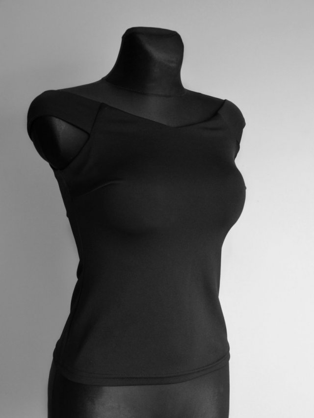 Świetna bluzeczka marki ATMOSPHERE. Czarna. Krój krótki, obcisły. Dekolt w kroju łódki. Na szerszych ukośnych ramiączkach. Na piersiach zaszewki. Dół prosty. Materiał grubszy, elastyczny.