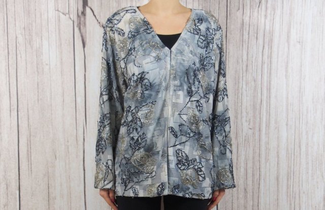 Elegancka marynarka w róże. Wierzch to moim zdaniem wiskoza z jedwabiem, pod spodem podszewka śliska, srebrna.