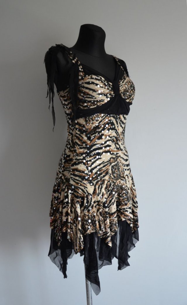 Propozycja na sylwestrową noc! Śliczna sukienka francuskiej marki CECILIA PARIS. Bardzo kobieca. Materiał bardzo elastyczny. Bogato zdobiona, wzór zwierzęcy. Pokryta miękkimi srebrnymi cekinami. Pod biustem odcinana półprzeźroczystym miękkim woalem (można go usunąć). Na cienkich ramiączkach, ozdobiona zwiewnymi kawałkami miękkiego woalu. Dół warstwowy, asymetryczny.