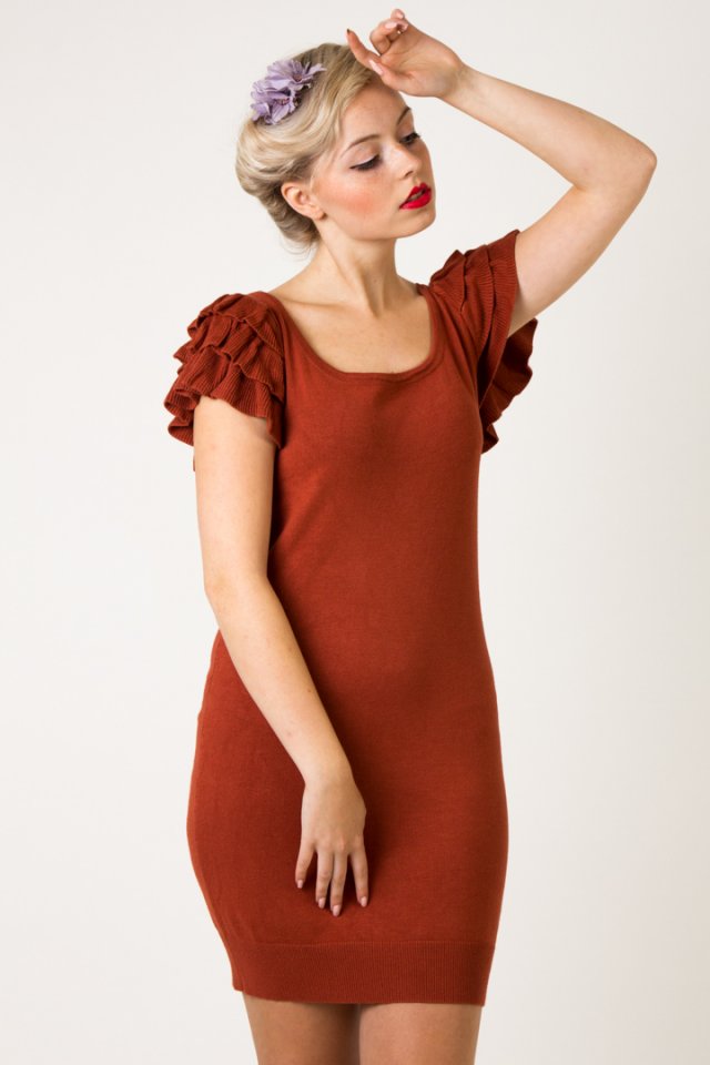 Elastyczna dzianinowa sukienka w kolorze ceglastym, zapinana z tyłu na zamek.