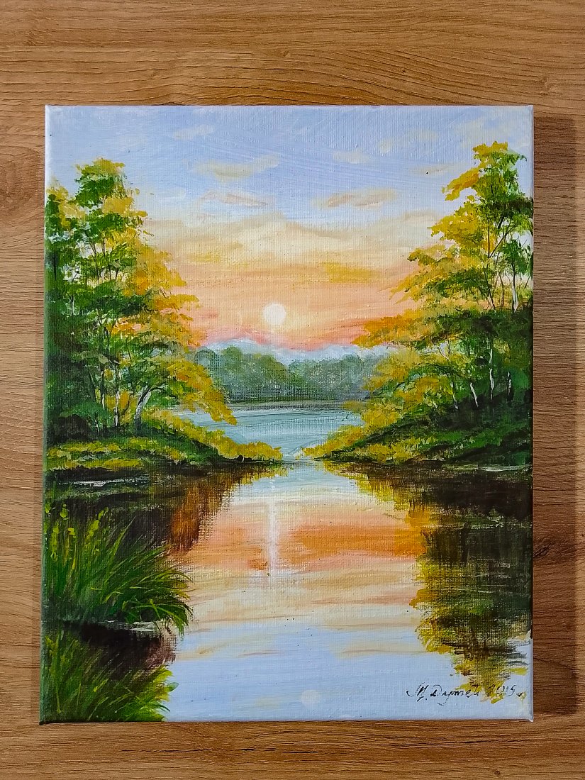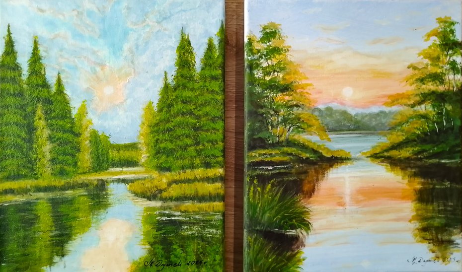 Unikatowy zestaw dwóch ręcznie malowanych obrazów, które stanowią harmonijną opowieść o świetle i naturze. Dyptyk ukazuje dwa różne oblicza leśnego jeziora:
