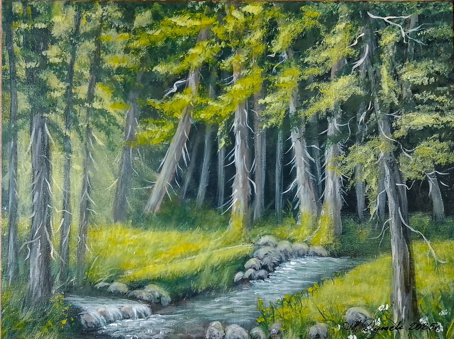 - Tematyka: Polski pejzaż, leśne krajobrazy z motywem wody i promieni słonecznych, gra światłocieni w gęstwinie drzew