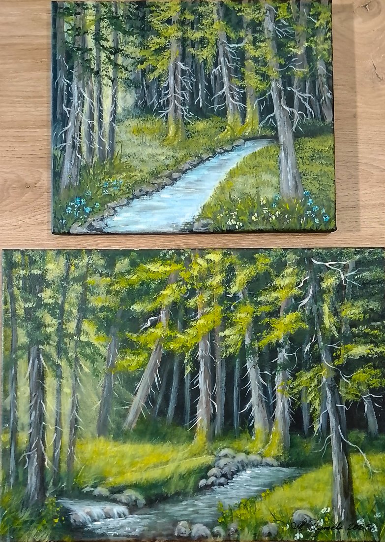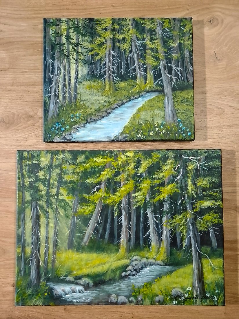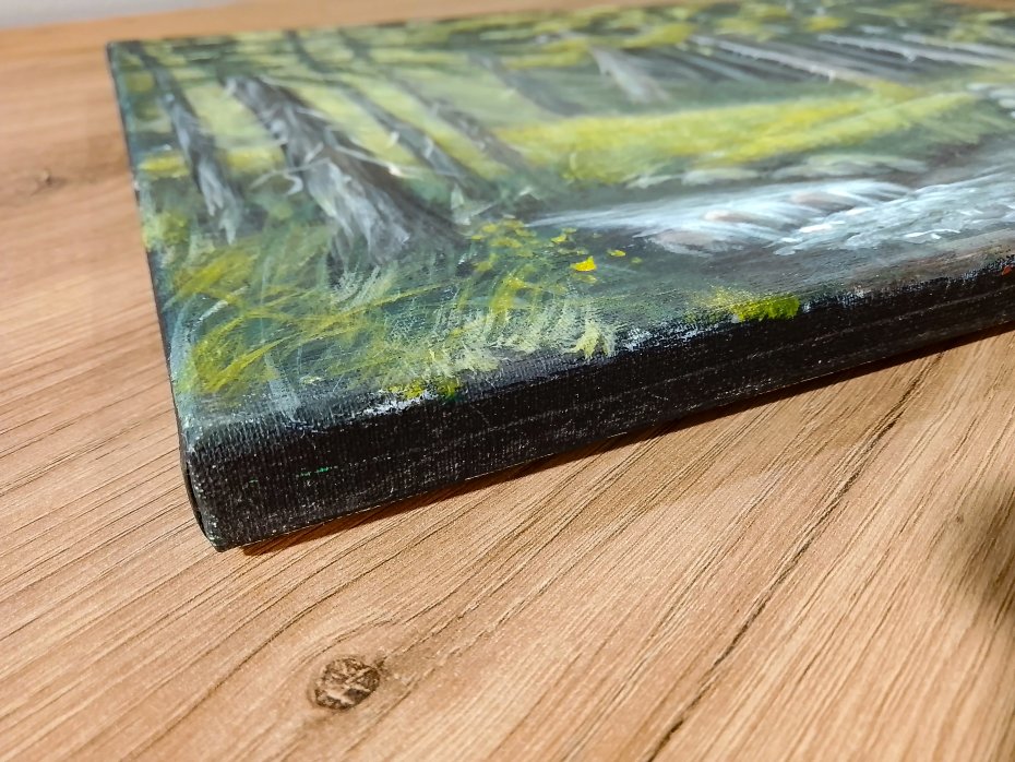 Unikatowy zestaw dwóch ręcznie malowanych obrazów, które stanowią harmonijną opowieść o świetle i naturze. Przenosi kojący klimat pierwotnej przyrody wprost do wnętrza. To okno na świat, na las pełen spokoju i światła.