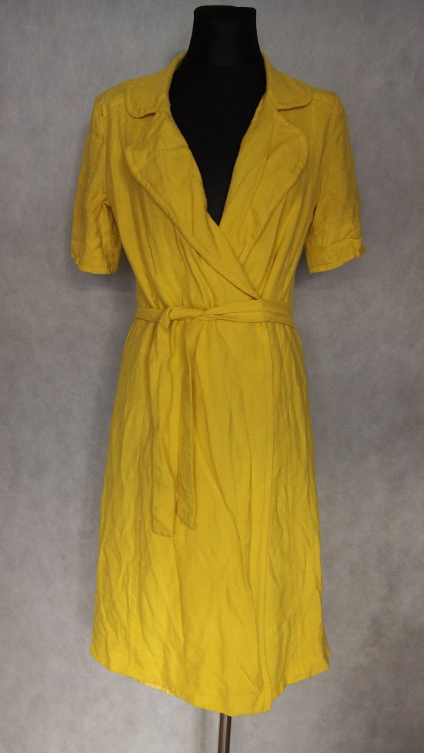 Sukienka vintage z lat 60-tych, kopertowa, na podszewce, z rayonu (sztuczny jedwab) tworzącego w tym wypadku grube, cieplejsze płótno.