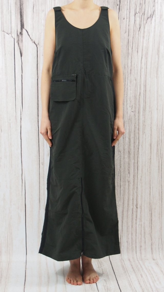 Nylonowa sukienka o artystycznym kroju. Kieszonka na piersi odpinana. Na dole zamek.