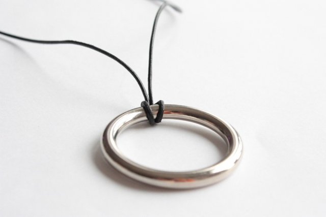 Naszyjnik z lekkiego wisiorka w kolorze srebrnym o średnicy 4,5 cm, na czarnym okrąglym rzemyku.