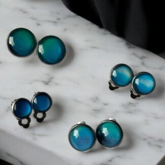 Widoczne tu klipsy łączą w sobie prostotę geometrycznej formy z unikatowym wypełnieniem. Oczka okrągłe w rozmiarze 16 mm.