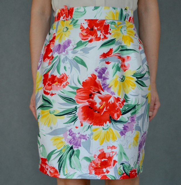 Śliczna ołówkowa spódniczka w kwiaty o wyrazistych barwach. Na podszewce.