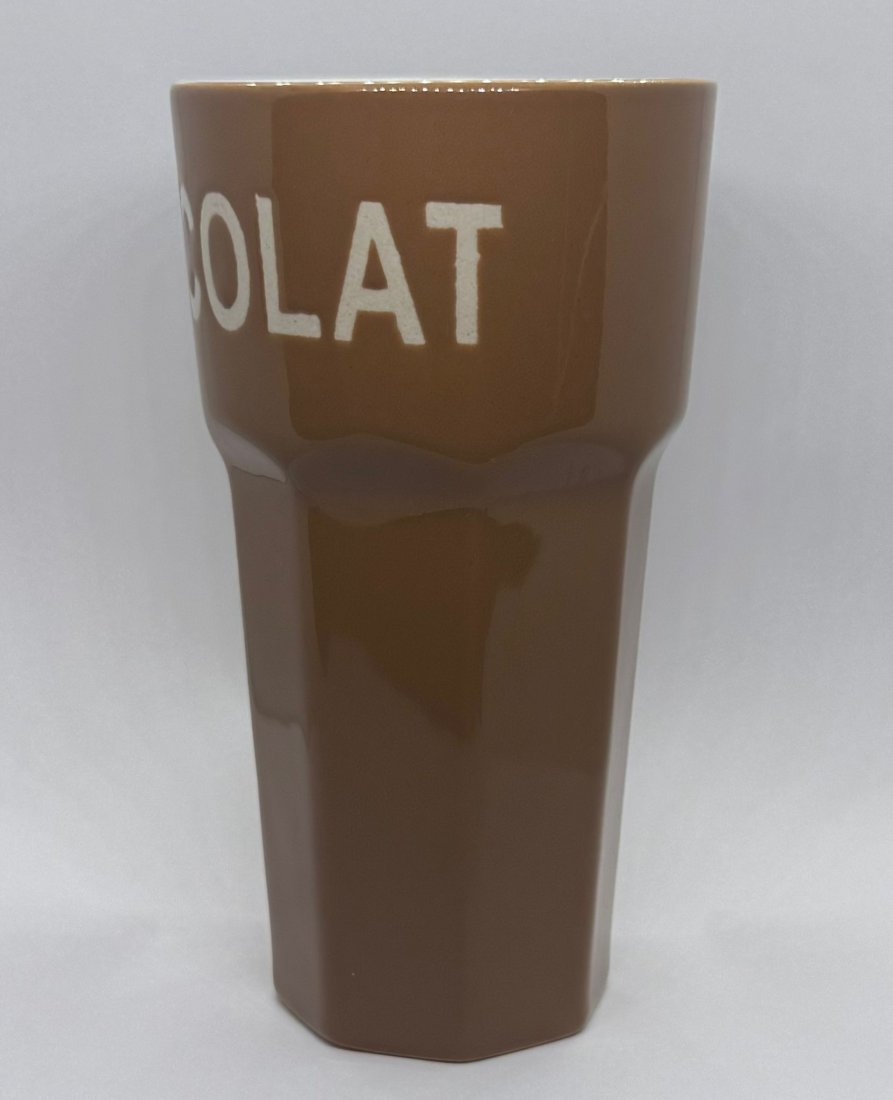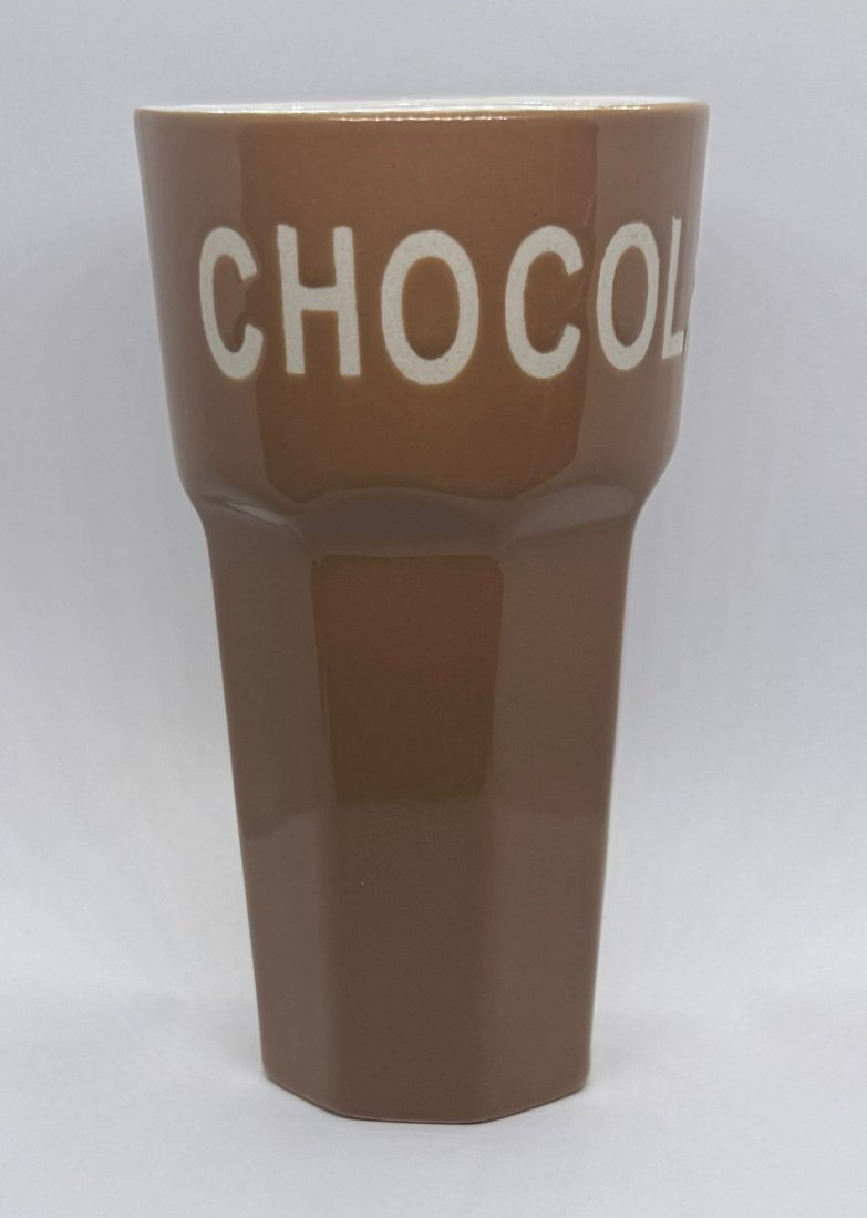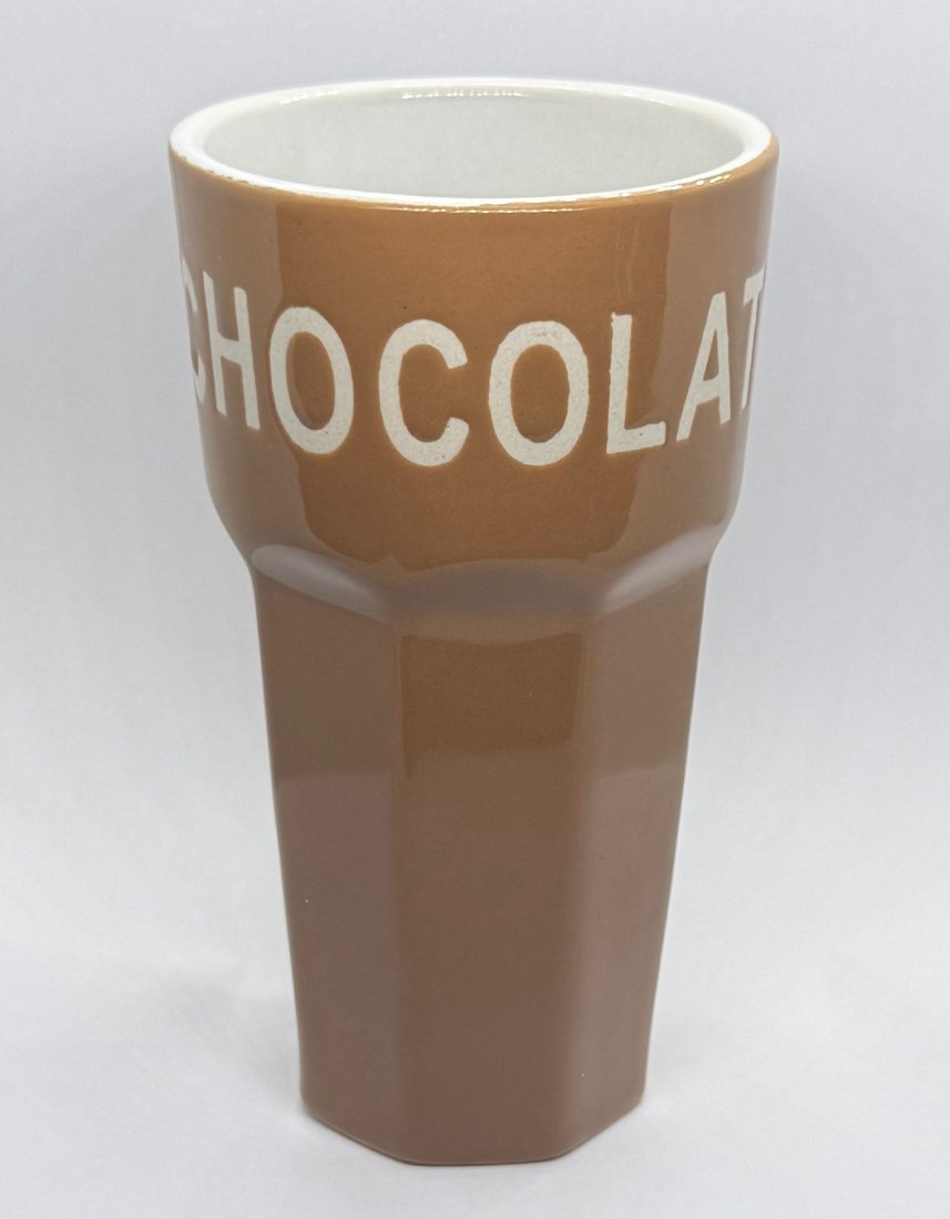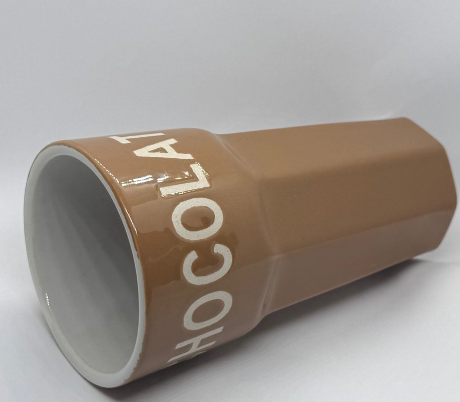 Wysoki kubek w stylu vintage, stworzony z myślą o miłośnikach kakao i gorącej czekolady. Utrzymany w ciepłej, karmelowej kolorystyce z napisem "CHOCOLAT", przywołuje klimat francuskich kawiarni i domowego relaksu przy aromatycznym napoju.